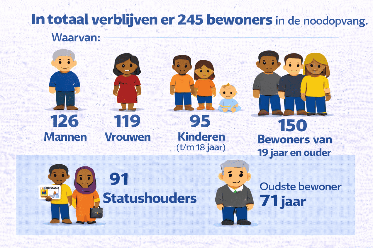 Op maandag 19 januari zijn de eerste bewoners aangekomen in de noodopvang. In de eerste week kwam er elke dag een groep nieuwe bewoners bij en na ruim een week waren bijna alle 250 plekken bezet. Ongeveer 2/3 van de bewoners zijn gezinnen met kinderen. De samenstelling ziet er op dit moment als volgt uit: